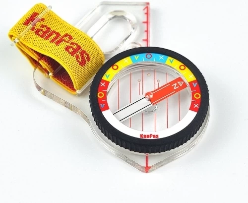 KanPas thumb compass with rainbow dial and fast, stable needle. This model has a 360 degree rotating capsule allowing it to be used as either a thumb compass or to set a bearing as with a standard baseplate compass.